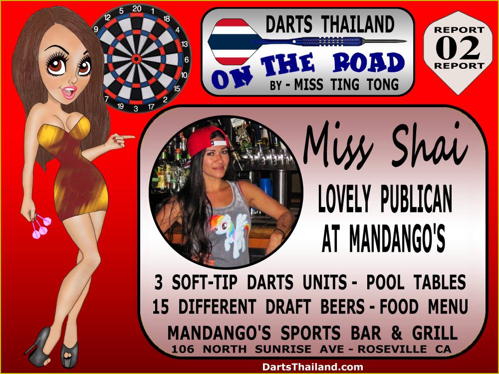 After dropping Mom off to do some shopping Johnny and his brother David popped into the nearest watering hole for a few refreshing beverages. They received a friendly welcome from Mandango’s Sports Bar & Grill’s lovely publican Shai. The place is a popular local with a friendly atmosphere. Compared to most pubs in Thailand this place is huge with a large wrap around bar – plenty of tables for dinning along with an outdoor area also the smoking area. Being a sports pub they have many large screens with a variety of sports and many pool tables. But most important – three soft-tip darts units and 15 different draught beers. Johnny was most impressed with the huge draught mugs. Asked what she’d like to say to our readers – Shai said to be sure and stop in if you’re in the area and although they don’t currently have a darts team in any league or regular darts events that all darts players are welcome. Looking forward to visiting Mandango’s again. – – Miss Ting Tong – DartsThailand.com