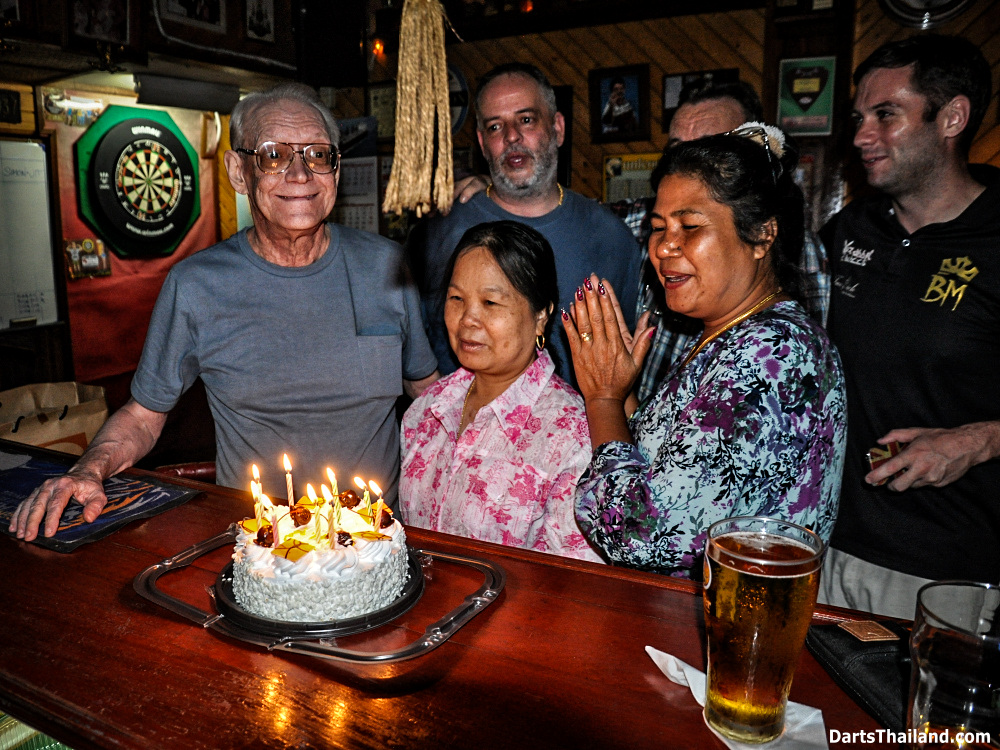 A True Bangkok Darts Legend – CW – and long-time friend to many here – celebrated his 70th Birthday this past Sunday 23 Aug at The New Cowboy Bar on Sukhumvit Soi 22. It was a day early but with those with work schedules – Sunday allowed our group the opportunity to get together to not only celebrate with CW but of course to get in some darts games. Along with the birthday boy we were welcomed to NCB by our skilled darts host – the ever affable Miss Tia. And Simon and his lovely better half – Jit – were in town and in attendance. Adam was down with his friend JJ – a first time player who by the way – managed a few tons on the night. With a well deserved break in his schedule our good friend KTD (Kenny-The-Dart) was raring to go & get in some darts with friends. After two months on the road – I was most happy to get together with these friends for a really great night.