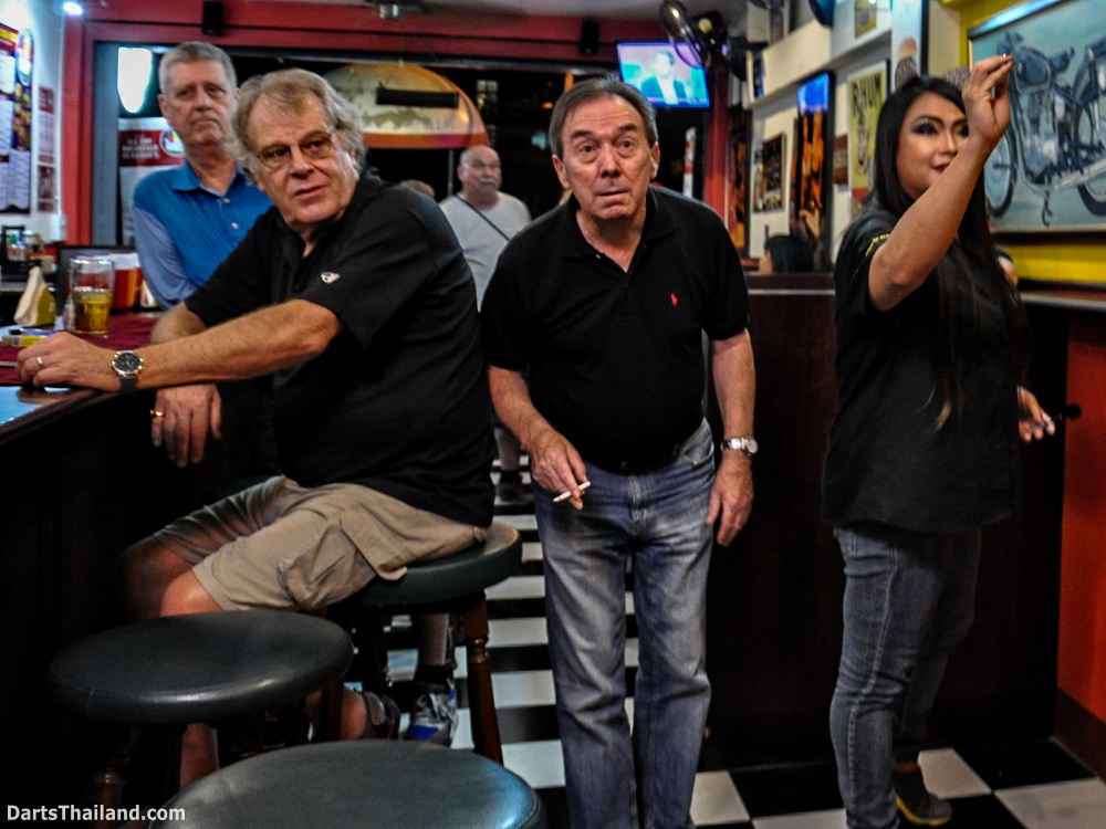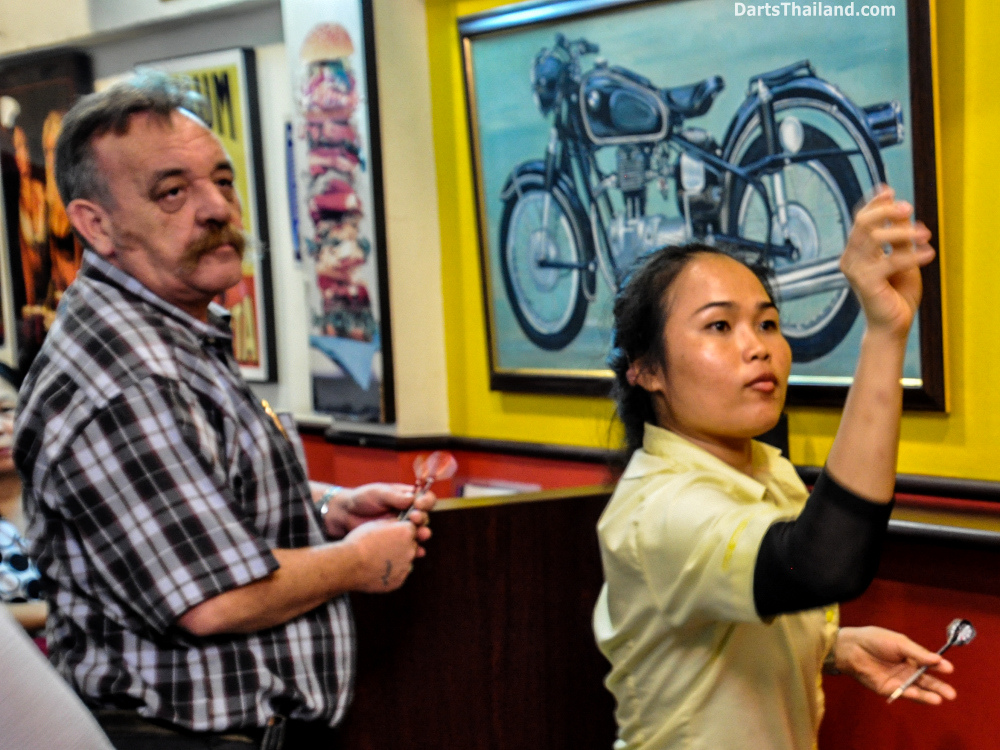 Buddy’s Bar on soi 89 has been open for a few months but the New Cowboy team had not yet played a darts match there so it was selected as the venue for match three. Well worth the jaunt down Sukhumvit Buddy’s second location is much like their original operation – a popular local pub with Buddy’s famous menu. The visiting New Cowboy team had the added advantage of adult supervision as Miss Tia lead the team herself.